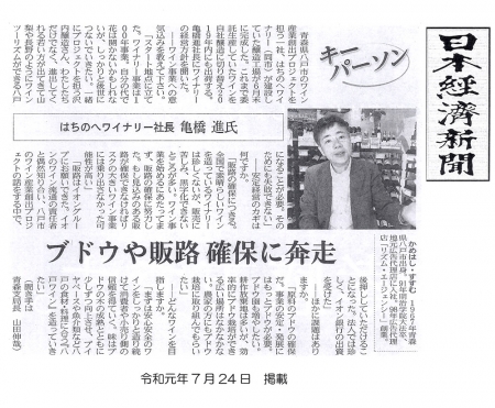 はちのへワイナリー社長 亀橋進が、2019年7月24日の日本経済新聞に掲載されました。